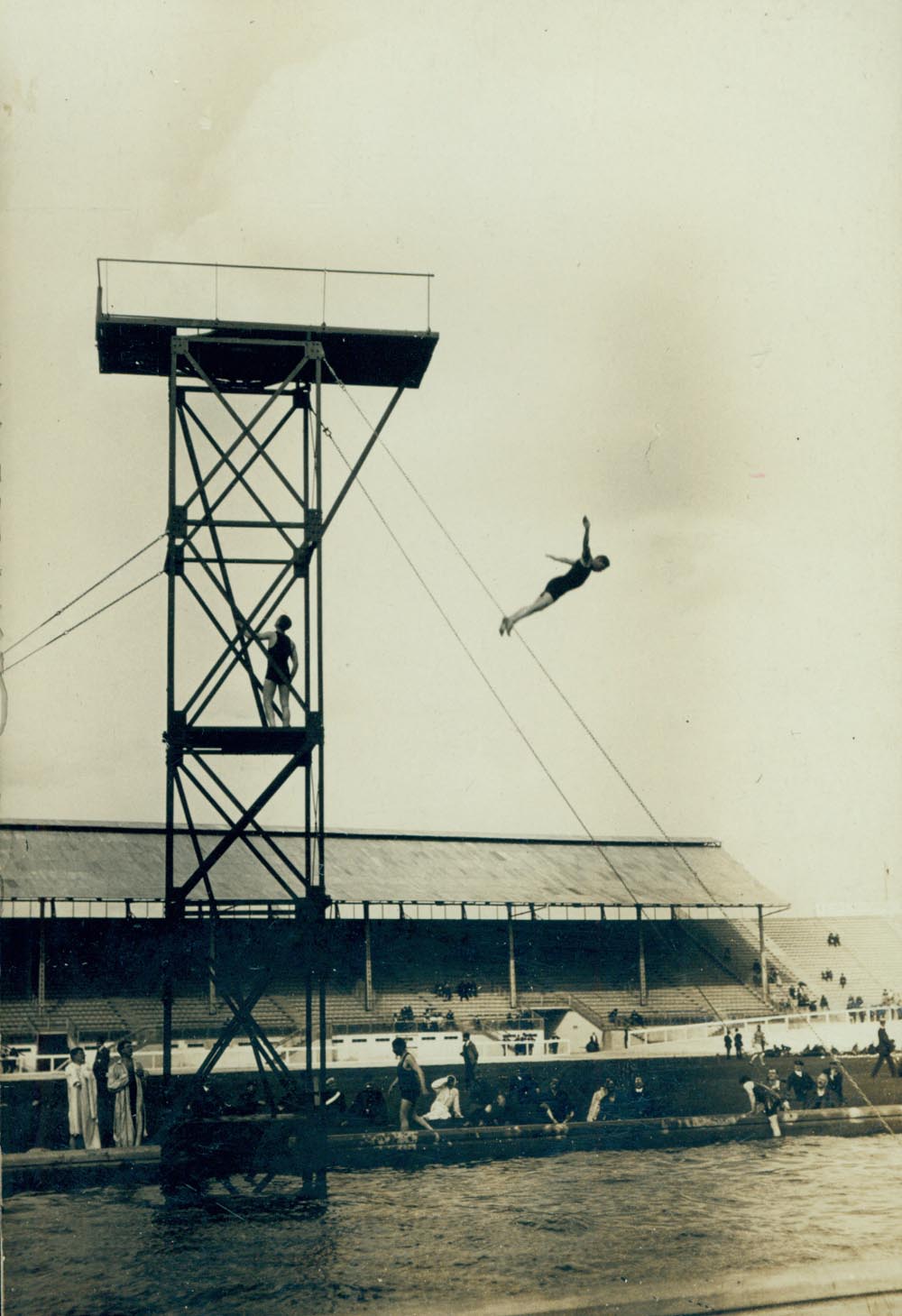 In November, English Heritage will publish a book (Played In London – Charting The Heritage Of A City At Play) on the topic, including lots of brilliant pictures like the one above, featuring the Furnivall Sculling Club, the first rowing club for women on the Thames, or these ones featuring the British swimming team in 1908 and the diving board at White City from that same year.