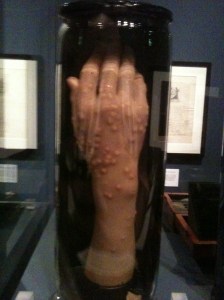 Those intrigued by the Gordon Museum can get some sense of its contents when you visit the Museum of London’s gleefully gruesome new exhibition, Doctors, Directors and Resurrection Men, where some Gordon Museum objects are on display. Prompted by the archeological excavation of a hospital graveyard which contained numerous early 19th-century skeletons, the exhibition explores the entwined topics of dissection, death, medicine and graverobbers with entertaining relish.