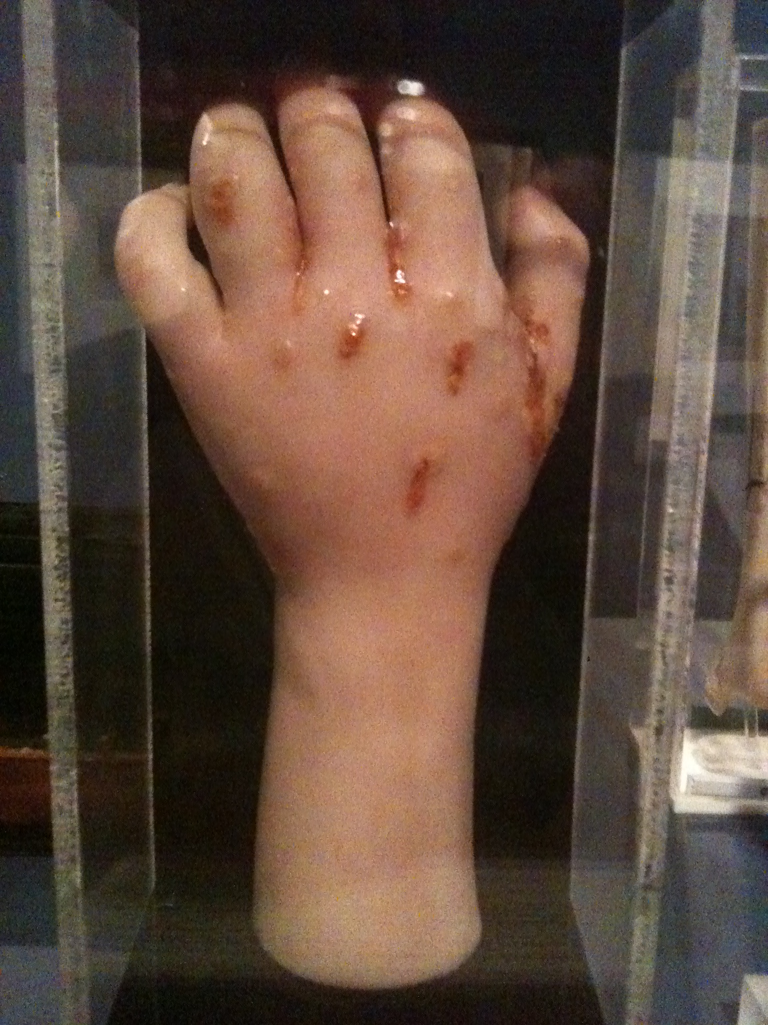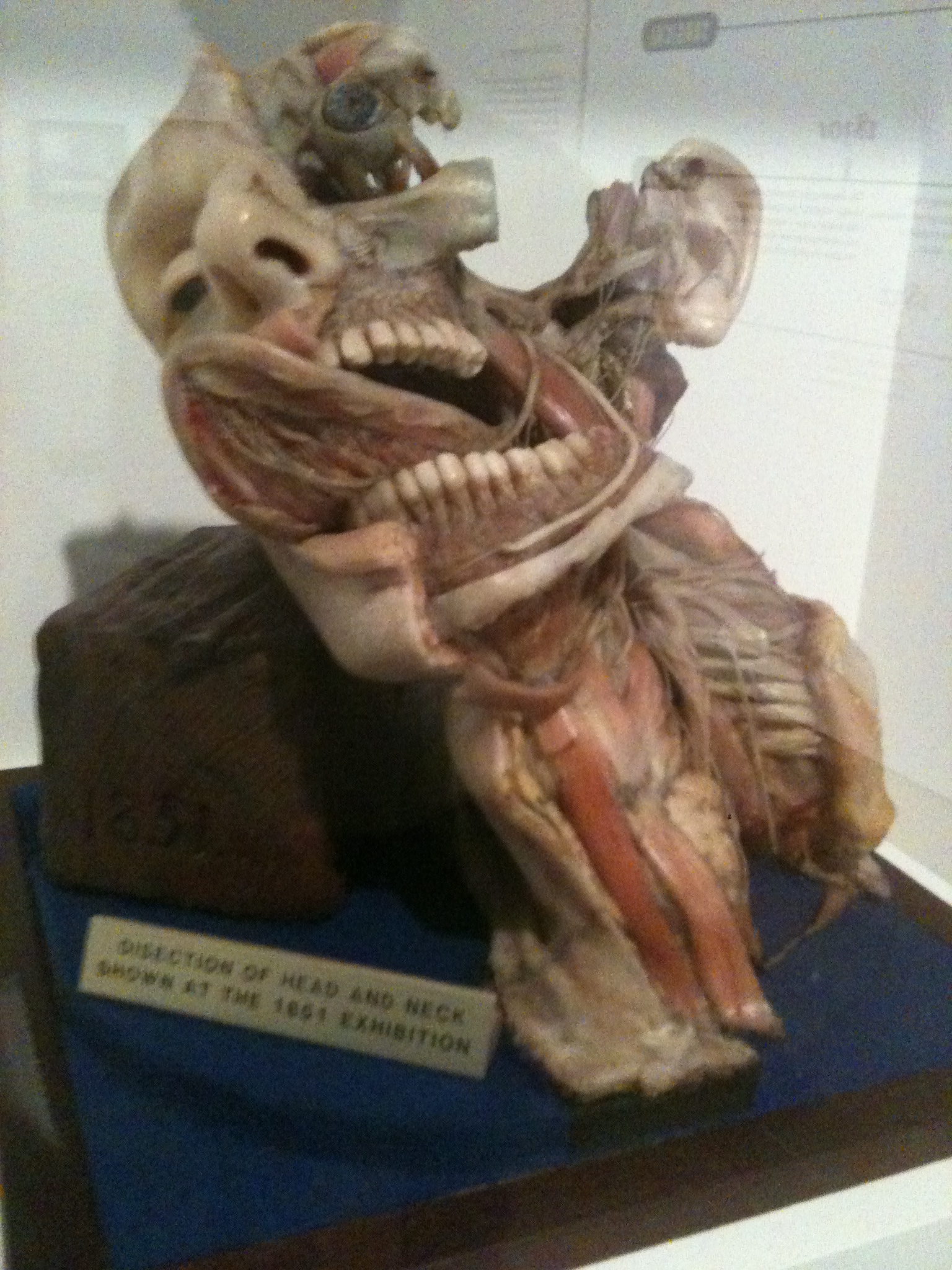 Ironically, then, the most dramatic exhibits tend to be models. The best of these is probably a loan from the Royal Academy of James Legg, a criminal who was flayed and posed on a cross to settle an artistic debate. Legg’s mutilated body was preserved in plaster. There are also a number of Townes’s models, including the stunning human skeleton he sculpted from wood at the age of 16, something he did despite never having seen one in real life and which earned him his job for life at Guy’s Hospital as their in-house model maker.