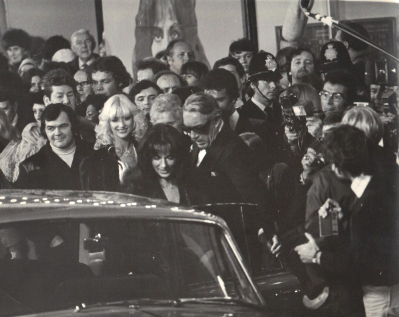Anthony Quinn and Jacqueline Bisset filming The Greek Tycoon, Leicester Square.