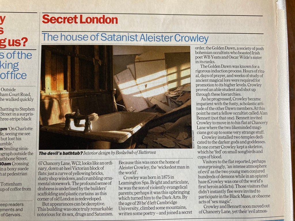 Several years ago, I commissioned a writer at Time Out to go and explore what we then described as one of occultist and writer Aleister Crowley’s few remaining London homes – an apartment at 73 Chancery Lane, that was about to be turned into offices. In these rooms, Crowley had set up a temple for his magical friends, the Order of the Golden Dawn, and our writer made a valiant attempt at conjuring up a spooky atmosphere from what was probably a rather forgettable set of empty rooms. He even quoted a builder working on the site who claimed to have discovered a human skull and pentangle formed from sticks.